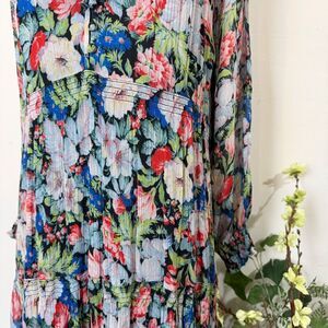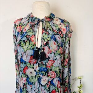 Flow effortlessly into boho-chic style with The Marais Printed Chiffon Maxi Dress from Anthropologie. This lightweight, semi-sheer beauty features a vibrant pink, blue, green and black floral print with subtle pleating, long billowy sleeves, and a tiered skirt for graceful movement. The split neckline ties with black tassels for a playful finish, and the matching black slip ensures perfect coverage. Perfect for festivals, date nights, or seasonal layering with boots or heels.