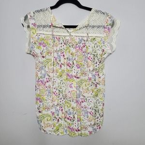 EXCELLENT pre-owned condition: Anthropologie's Meadow Rue Nellore Floral Lace Blouse in White with Multicolor floral print. Floral with lace detail and tie at the nape of the neck. MSRP $128