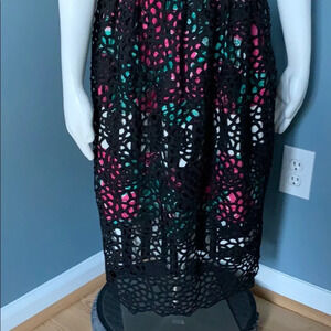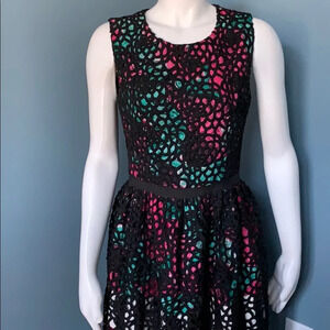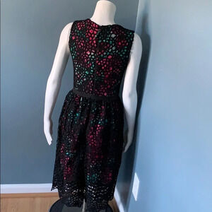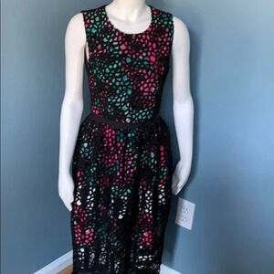 Sleeveless. Pink and green floral print. Black woven floral overlay. Zipper back. Defined ribbon waist. Size 4.