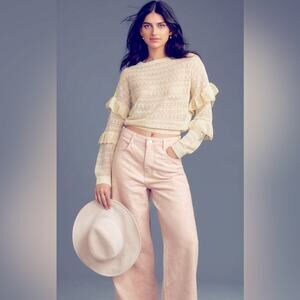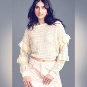 ANTHROPOLOGIE Womens Sweater Size XS Cream Sheer Open-Stitch Ruffle Coquette