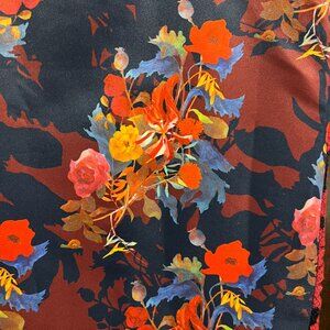 Floral Print on a deep red and navy background.