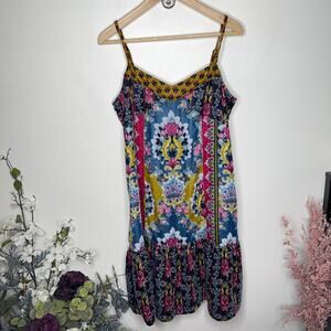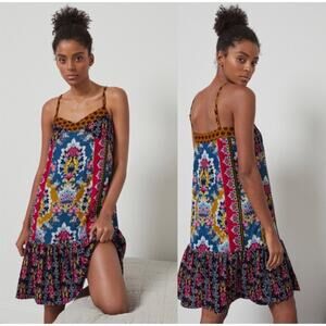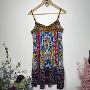 Anthropologie Velvet dress with a boho Gypsy vibe. The colors are stunning in person. It has adjustable straps, flouncy hem, made of 100% polyester so it’s machine washable.