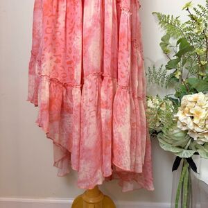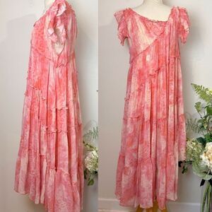 This flirty and flowy Anthropologie dress brings effortless style with its dreamy coral hues and asymmetric ruffled tiers. Lightweight and breezy, it’s perfect for summer events, casual outings, or just twirling through warm evenings. Includes a coordinating slip dress for easy wear and coverage.