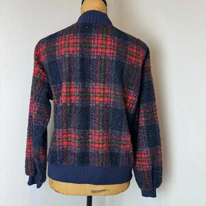 Soft and cozy holiday sweater by Porridge sold at Anthropologie. Beautiful faux Sherpa / Teddy in navy and red plaid