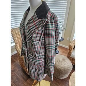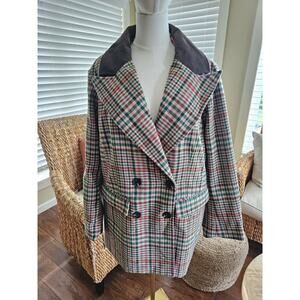 Beautiful wool blend plaid blazer with patches on the sleeves at elbows. Blazer is in excellent condition and comes from a clean and smoke free home. Please see measurements in the photos.