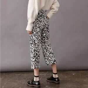 Make a bold and modern statement with these Anthropologie x Maeve Plive Floral Cropped Flare Pants in classic black and white. Designed with a high-rise fit and cropped silhouette, these eye-catching pants feature a bold botanical floral print that blends artistic minimalism with playful sophistication.
