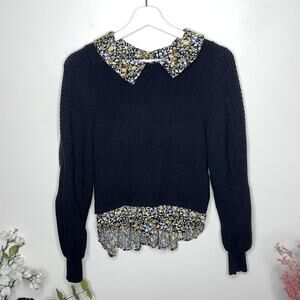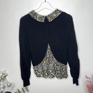 Maeve Textured Twofer Pullover Sweater; Black with floral print; Soft lightly textured knit bodice & sleeves, Woven Peter Pan collar & hem, balloon sleeves, Decorative button back detailing; Pullover; 47% viscose, 29% polyester, 24% polyamide; 100% cotton; Hand wash; Imported