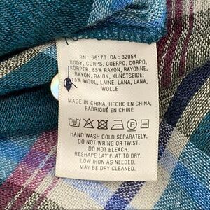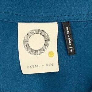 Akemi + Kin by Anthropolgie. Long sleeve button down plaid tunic in blue/green/purple/gray/black. Flowy pullover. Can easily roll buttoned cuffs and tie front shirttail into peekaboo. Pairs well with boyfriend jeans & white sneaks. Fabric slightly worn above left chest & right chest but barely noticeable (Photo 7 & 8). Loose fit. Discontinued style. Smoke-free and pet-free home.