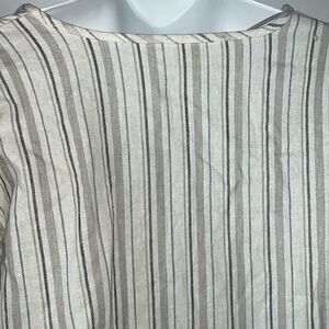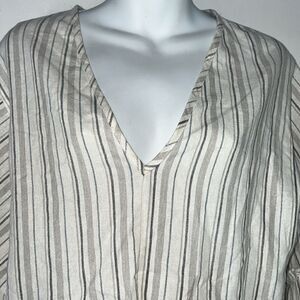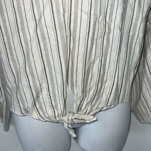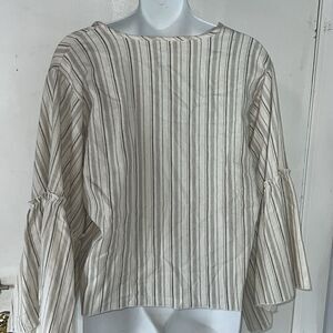 Washable rayon linen blend in an off-white with black, gray and blue stripe detail, ruffle bell sleeve detail with tie front and V-neck. Excellent condition. Size medium, measures 20” from armpit to armpit and 21” from top of shoulder to bottom hem.