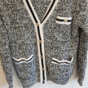 Cardigan has two front pockets and 5 button closure in front. extra button and thread attached to tag.