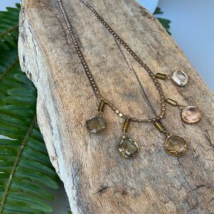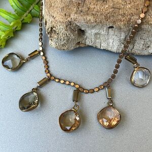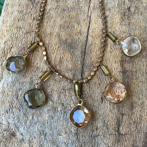 A delicate and elegant necklace from the Serefina range at Anthropologie, five different colored glass stone pendants on a flat circular old gold colored chain. Lobster clasp fastening. Worn once
