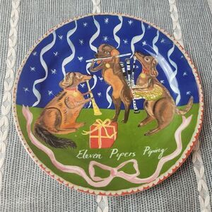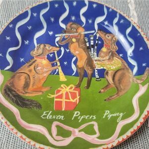 Anthropologie X Emily Maude 12 days of Christmas 'Eleven Pipers Piping' dessert plate.