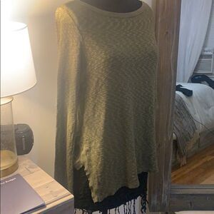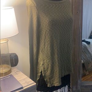 ANTHRO left of center moss green blouse flowy swing style long sleeve deep army forest moss green color with knit panel in front and raw edge hem slight asymmetrical hem very flattering piece size Small