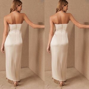 Part of a special collection from BHLDN. For the full assortment, visit BHLDN.com. This dress is the epitome of elegance: silky smooth, wrap detailing, and a clean skirt slit. Fit for any bridal or formal occasion, this modern design is a winner.