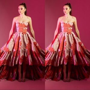 Large scale florals and a dramatically ruffled high-low hem make this vibrant, strapless gown our pick for a festive occasion.