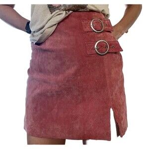 ANTHROPOLOGY Blank NYC 100% Leather PINK Suede Buckle Moto Mini Skirt Size 28