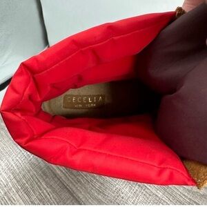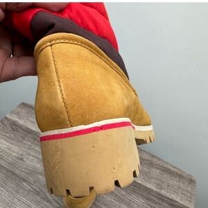 ANTHROPOLOGY CECILIA NY TILDEN woman tan luxury work boot with colorful top. See all photos some damage to front corner and back heel.  Not super noticeable.  Sold out in stores. Great preowned condition