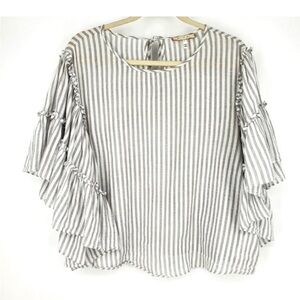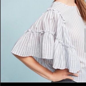 ANTHROPOLOGY ERI +ALI XS Jacqui Grey White Striped Ruffle Sleeve Cotton Top