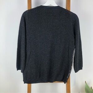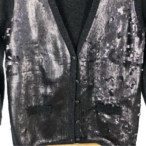 I love this cardigan! Its a wool & cashmere blend. The sweater part is a charcoal gray color. The sequins on the front are black. It is a v neck with button and two slit pockets. It’s a short box style and fit. What I love about this sweater is how versatile it is. You can wear it with Jean and a t shirt for a glam casual look or you can wear it with dress pants or skirt for a dressier look. It’s in great condition. Great for the holidays as well. Size S