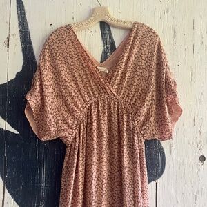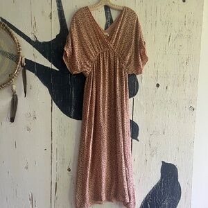 This dress is super feminine maxi dress. A flower bud design in a beautiful peachy, blush and soft tan.. Elastic empire waist, Butterfly and drop shoulder sleeves, with a built in slip and a kick slit in the back. It’s a perfect spring summer dress for the evening or a daytime garden party is perfect for a casual wedding or just out with friends. Pair of the stress with Beautiful strap, sandals or a wedge heel or a mid heel sandal it’s super comfortable. I actually wear this dress when I was pregnant so it would complement a growing belly..