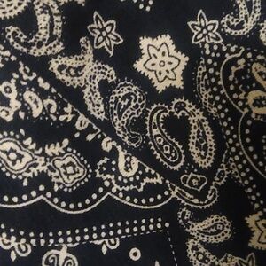 BOHEMIAN GOES NEXT LEVEL.RIGHT DOWN TO THE BUTTONS. THIS IS A SOFT KNIT STRETCH FABRIC THAT IS SUBSTANTIAL. THIS IS A STATEMENT PIECE FOR SOMEONE THAT IS CONFIDENT IN THEIR STYLE. IT HAS A BIT OF GATHERING AT THE SHOULDER. THE SLEEVES CAN BE ROLLED UP. THE COLLAR IS ROUND ON THE LEFT & POINTED ON THE RIGHT. THIS IS A SOFT, FLOWY & LINED. THIS COULD ALSO BE STYLED WESTERN OR STREET STYLE EASILY. THE PRINT IS BLACK & CAFE LATE CREAM.