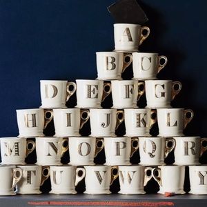 ANTHROPOLOGIE Gold "R" Coffee Mug from the discontinued Limited Edition Gold Alphabet Collection! Mug has gold detailing on handle and at bottom edge (see all pictures) Inside of mug is spotless! Mug has no chips. Measures 4"H x4"Diameter! See all detail pics.