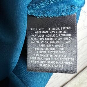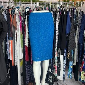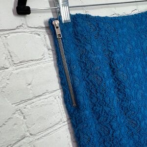 Excellent condition. Blue lace skirt. Perfect, but for the little extra to the slit on the side of the lining (pictured), outer is abso perfecto beautiful. Size Small. Approx measurement in inches when laid flat: waist 13.5 across, full length 24. 46% acrylic, 34% nylon, 20% wool, lining 96% polyester, 4% spandex.