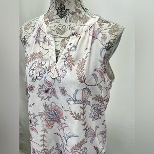 Pale pink floral sleeveless blouse from ANTIBES BLANC, size S. Top has slight V, razor back and is fully lined.