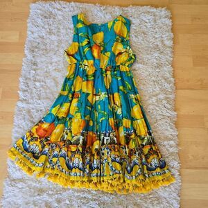 Bright and colorful sleeveless dress with a floral pattern. Features a mix of blue and yellow hues.