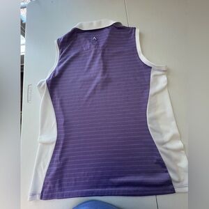 Stylish sleeveless ladies shirt with a button-down front. Features a lavender body with white accents. Perfect condition