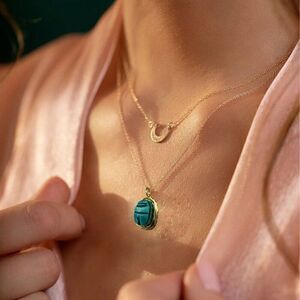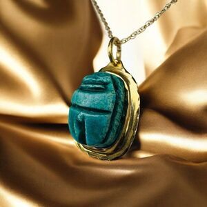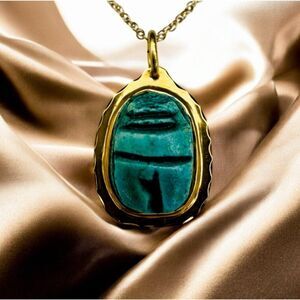 A beauty to behold! A treat to the eye! This necklace alludes to a more magical, ethereal existence where hidden beauty comes to life! This is a solid 14k Yellow Gold Antique Victorian era Turquoise Scarab Hand Carved Scarab Charm Pendant Faience Fob Necklace.The pendant is a nice size, measuring in at 22x13mm. Solid 14k Gold Chain is 18" total length. Weighs 2.4g. Turquoise Carved Scarab measures 12x9x6mm. This is a stunning, unique beauty and would make an excellent gift!!!!