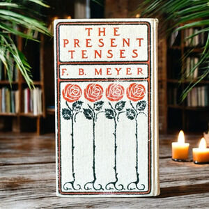 This beautiful antique 1892 edition of The Present Tenses of the Blessed Life by F.B. Meyer features an ornate, floral hardcover design with detailed red roses and intricate vine illustrations. A rare and timeless piece for collectors of Christian literature.