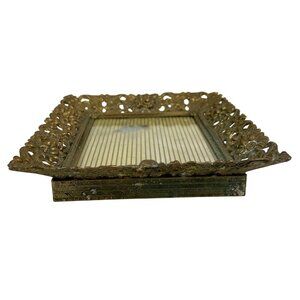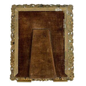 Corners (photos #5 & 6) are worn down. Easel is too flimsy to hold the weight. FRAME: Width: 4.5", Height: 5.5", Depth: 1". Photo size: 3" x 4".