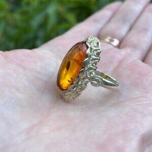 ANTIQUE AMBER RING FANCY SILVER SIZE 7
