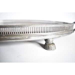 Perfect for cocktail ingredients and accessories, late 19th century English tray by the Sheffield firm Roberts & Belk in silver plate and tiger oak, with a reticulated gallery border, two ridged side handles, four horse-hoof feet, and central heraldic shield chased with the monogram letters S, F, A. Identifying stamps on bottom. Original condition.
