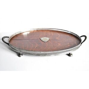 ANTIQUE English Sheffield Silver & Oak Drinks Tray