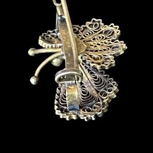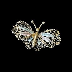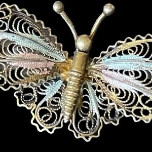 Antique signed 800 silver filigree open work butterfly pin brooch. Has some lightly painted enamel in pinks and blues. This is very old as it has a c clasp closure. The pin is stuck in the c clasp closure in order to keep it closed. Would need to open up to get the pin out, easy little fix/adjustment. Small in size at 1.25”x1.5”.