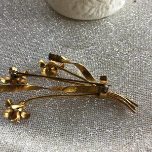 VERY OLD BROOCH. GOLD TONE WITH 3 ENAMELED PINK FLOWERS WITH LARGE PINK STONES. HAS A MARK ON BACK (HARD TO READ. BELIEVE CORO IS STAMPED NEAR THE BOTTOM. PROBABLY FROM THE 1940'S