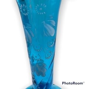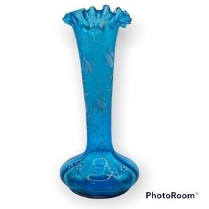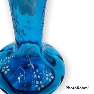 ANTIQUE Hand Painted Victorian Blue Hand-Blown Glass Bud Vase