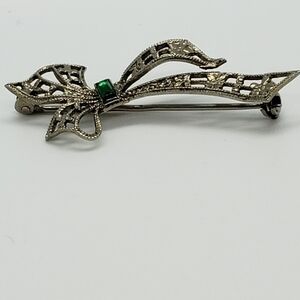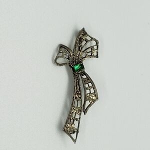 ANTIQUE Sterling Silver Filagree Laced Bow Brooch Pin Maker Signed ArtDeco Green