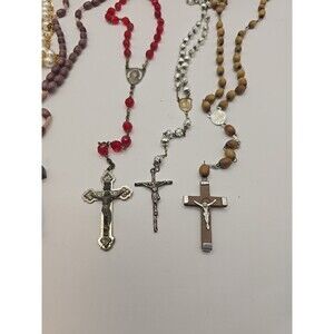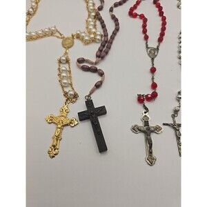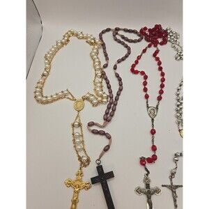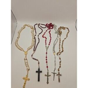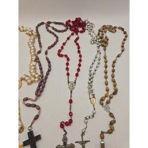 This set of 5 antique and vintage Catholic rosaries includes a variety of designs featuring crucifixes, Virgin Mary figures, and other religious symbols. Each piece is a unique collectible item that embodies the Christian faith and spiritual traditions. These vintage rosaries showcase the beauty and history of religious artifacts, making them a valuable addition to any collection or a meaningful gift for someone of faith.
