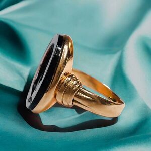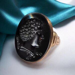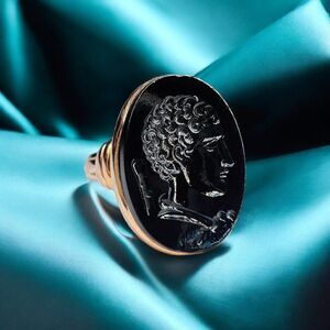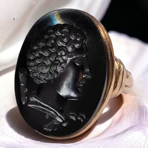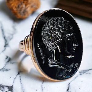 A RARE Georgian era, late 18th century Solid Gold Black Carnelian Intaglio Ring with hand engraved Hercules Image. The oval dark carnelian measures 18x14mm. Seal-engraving features a classic greek god Hercules or the alternative greek spelling of "Heracles", detailed hair and profile along with his favored weapon, the thorned club, in a yellow gold setting with a closed back and tapering gold shoulders and band. Shoulders measure 6.5mm, band measures 3.8 - 2.45mm. Gorgeous, high quality masculine warrior god carving. A microscopic chip at the top of the signet noticed upon magnification, which, fortunately does not compromise the stones stability. Ring is a size 6.5, and weighs approximately 4.7grams. Stone is a deep blood black color, viewed under close light it features beautiful reddish tones carnelian is known for inside of the carving. It is closed back, so light is limited from entering stone so expect a mesmerizing darkness. Excellent gift or addition to your collection! Gold karat is unknown, but is guaranteed solid gold, not plated or filled!