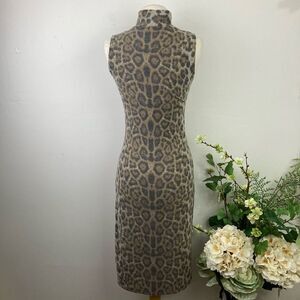 A sexy body con leopard print dress with mock neck. Sleeveless. Fuzzy fabric.