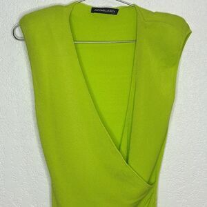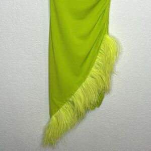 Lime green ostrich feather Eva feather-trim dress from Antonella Rizza featuring bodycon design, feather-trim detailing, V-neck, short sleeves and asymmetric hem.
