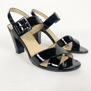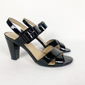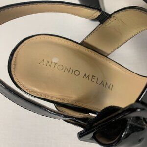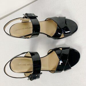 Antonio Melani Black Patent Sandals. Size 7.5. Dressy black patent sandals with cute buckle across the top with stretch. Heel is 3 1/2". Beautiful shoes! Great condition.
