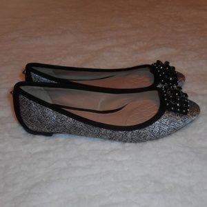 Elegant flats with a textured silver design. Black trim and decorative embellishment. Perfect for any occasion.