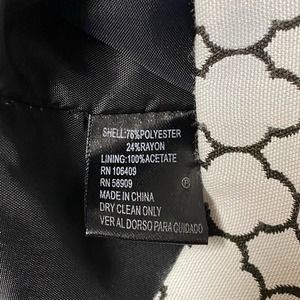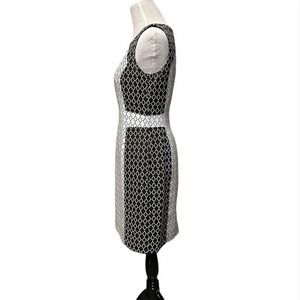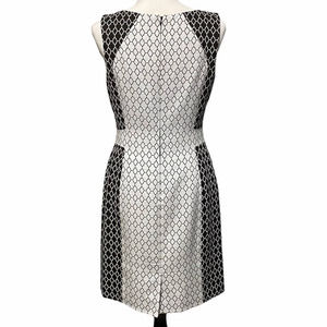 Elegant sleeveless dress with a geometric pattern. Features a classic black and white design. Perfect for formal occasions.