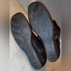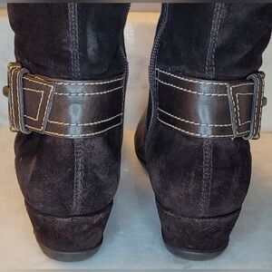 In very good used condition, these boots are meticulously crafted with leather upper, a man-made sole, and a fabric lining, ensuring durability and comfort. The decorative buckle details add a touch of flair to elevate your ensemble.