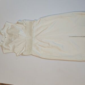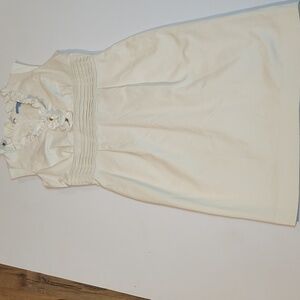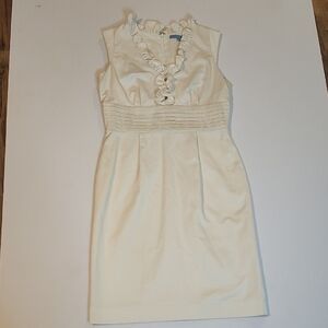 This sophisticated cream mini dress by ANTONIO MELANI features a sleeveless design with a ruffled crew neckline and pleated details, perfect for a wedding guest or cocktail occasion. The sheath silhouette offers a flattering fit, making it an elegant choice for formal events.
