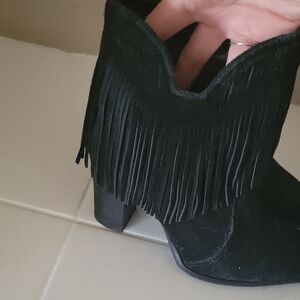 Chic dark suede booties with fringe accents. Ideal for a trendy outfit.